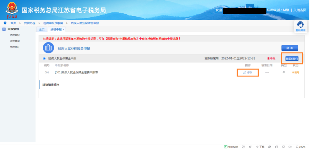 一年一度的残疾人就业保障金申报缴纳工作正在进行,截止时间为2023年12月31日。如何快速地完成残疾人就业保障金申报缴费,一起来学习吧! 01 登录国家税务总局江苏省电子税务局 (http://etax.jiangsu.chinatax.gov.cn)。 登录后,点击首页“我要办税”下方的“税费申报及缴纳”,点击非税收入申报中的“残疾人就业保障金申报”,或在首页上方搜索栏中直接搜索“残疾人就业保障金申报”,进入申报界面。 02 核实系统带出的“税款所属期”是否正确,确定2023年申报的残疾人就业保障金税款所属期应为2022-01-01至2022-12-31。点击“进入申报”。 03 点击右侧“数据初始化”,提示成功后,点击“修改”。 04 点击“修改”系统弹出“残疾人就业保障金缴费申报表”,并提示是否安置残疾人就业,如不属实可前往残联部门审核。点击“确定”,填报申报表。 05 点击“增加一行”,填写第2列“上年在职职工人数”以及第3列“上年在职职工工资总额”。如上年实际安排残疾人就业并经残联审核,第5列会自动打出“上年实际安排残疾人就业人数”,否则默认为0。 06 减免性质中有三项,分别为“0035013601|残保金调整为分档征收”“0035049901|在职职工总数30人(含)以下暂免征收残保金”“3299011601|自然灾害或其他突发事件残保金减免优惠”,原则上减免性质无需自行选择,系统会依据填入上年在职职工人数系统自行判断。 07 第2列、第3列数据填报后,申报表自动计算“本期减免费额”和“本期应补(退)费额”。对申报表自动计算的结果核实无误后,点击左上角“保存”。 08 提示“暂存成功”后点击“确定”,再点击“返回”返回上一页面,点击“申报”。 09 当申报状态为“申报成功”后,页面显示如下: 10 若发现申报错误可以在“申报错误更正”模块进行“申报更正”。 11 申报数据确认无误后,点击“税费申报缴纳”模块中的“税费缴纳(含申报及更正)”进行缴款。 12 缴款成功后,在“我要办税”下方“证明开具”中点击“开具税收完税(费)证明”打印缴费凭证。